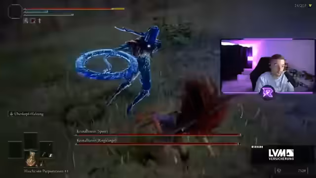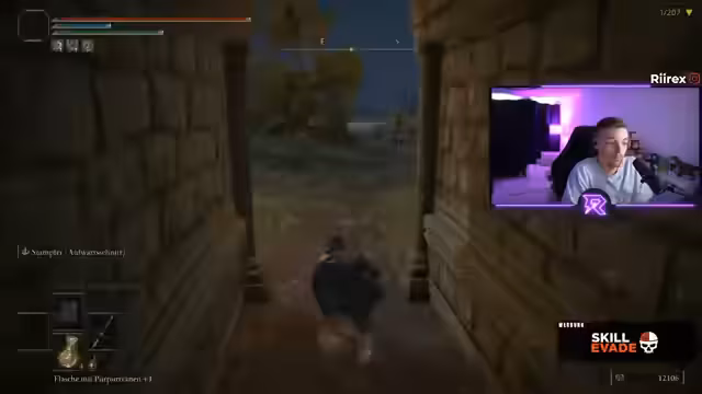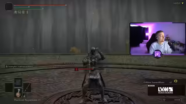 00:01:06Der Stream beginnt mit einem Elden Ring Randomizer Run im Limgrave. Der Streamer stellt fest, dass er die Nachrichten im Chat missverstanden hat und tatsächlich der erste war. Es wird die Waffe Flamberge als Hauptwaffe gewählt, da sie im Vergleich zur Ausgangswaffe bessere Stats bietet. Die Runen werden für Level-ups und das Waffenscaling investiert, um den Schaden zu maximieren. Ein wichtiger Talisman für den Run ist der Schildkrötentalisman, der die Ausdauer erhöht.
