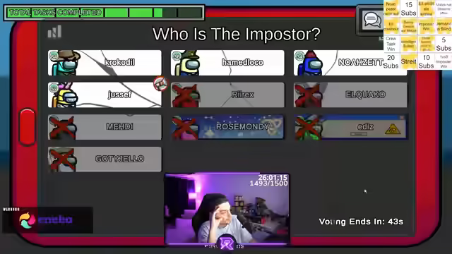 09:59:42Es beginnt eine hitzige Diskussion über die Tötungen im Spiel. Es wird spekuliert, warum Eli getötet wurde, und Noah wird verdächtigt, der Täter zu sein. Die Spieler analysieren die Bewegungen der anderen Teilnehmer, um die Schuldigen zu identifizieren. Edis gesteht, dass er jemanden aus Rache gewählt hat, was zu weiteren Diskussionen führt. Es wird über die Positionen der Spieler und mögliche Doppel-Kills diskutiert, wobei Remax beschuldigt wird, bei Admin gesehen worden zu sein. Die Lobby scheint zu laggen, was die Situation zusätzlich erschwert. Es wird betont, wie wichtig es ist, Eli zu töten, da er zu viel Macht in der Lobby hat. Einige Spieler äußern ihren Unmut darüber, dass sie trotz Alibis gevotet werden. Die Diskussionen drehen sich um die Frage, wer den Kill hätte machen können und wer sich wo aufgehalten hat. Es werden verschiedene Theorien aufgestellt und widerlegt, wobei die Spieler versuchen, die Wahrheit herauszufinden. Danny, Medi und Kroko geraten in Verdacht, und es wird spekuliert, dass Danny seinen Imposter-Mate schützen wollte. Die Spieler behalten die verdächtigen Personen im Auge und versuchen, deren Verhalten zu deuten. Es wird auch über die Möglichkeit eines Shapeshifters diskutiert, was die Situation noch komplizierter macht.