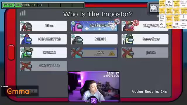 09:25:03Es wird 'Among Us' gestartet, wobei die Zuschauer im Chat aktiv am Bingo teilnehmen sollen. Ein YouTube-Stream für Zuschauer ohne Werbung wird eingerichtet. Es wird über frühere Streams und Zuschauer diskutiert, wobei die Streamerin versucht, sich Namen zu merken. Es wird über das Phänomen des Lurkens gesprochen, also des stillen Zuschauens ohne Interaktion. Die Streamerin äußert den Wunsch, Impostor zu werden und fragt nach einem Clip von Alan und Marlene vom Vortag. Es wird über Weekendick in Among Us gesprochen und über FIFA-Grind. Ein neuer Modus in FIFA wird als Pay-to-Win bezeichnet. Es wird überlegt, ob ein Controller kaputt gemacht werden soll, was Konsequenzen hätte. Es wird über kommende Events gesprochen, darunter ein Dortmund-Leipzig-Spiel und ein Besuch in Köln. Es wird über Reiswaffeln als Knastessen und eine bevorstehende Diät gesprochen. Es wird über Call of Duty Prime und Fortnite Prime diskutiert. Die Streamerin gibt bekannt, dass sie früher ein großer R9-Fan war und sogar seinen Haarschnitt hatte. Es wird überlegt, ob mit oder ohne Angel gespielt werden soll. Die Streamerin fragt, ob Rose 9- oder 12-Stunden-Streams macht und kündigt an, dass sie heute kein Geld verlieren will. Es werden Regeln für das Spiel festgelegt, darunter eine Mindestspielzeit von zwei Stunden und das Akzeptieren von Beleidigungen (außer bestimmter Wörter). Die Subs sollen am Ende bezahlt werden und es wird ein Anruf gestartet, um fehlende Spieler zu erreichen. Es wird über Discord-Probleme gesprochen und überlegt, ob zu TeamSpeak gewechselt werden soll. Die Streamerin äußert Frustration darüber, seit zwei Wochen nicht Impostor gewesen zu sein.