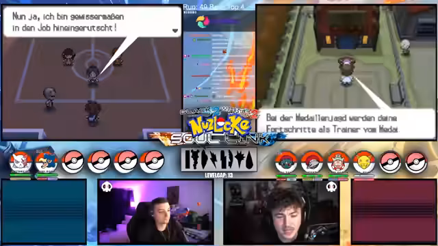 00:08:25Der Stream beginnt mit Begrüßungen an die Zuschauer. Der Streamer, ursprünglich ohne geplanten Stream, entscheidet sich spontan, gemeinsam mit einem Mitspieler die Soullink Challenge in Pokémon Schwarz 2 zu starten. Die Reise beginnt in der Taubier, gefolgt vom Dowsinghof, der von anderen Trainern überlaufen ist und bereinigt werden muss. Der Streamer ist müde und leidet unter schlechter Konstitution, dennoch will er das Team aufbauen und wichtige Items wie den Mondstein für seine Nock- Pokémon finden.