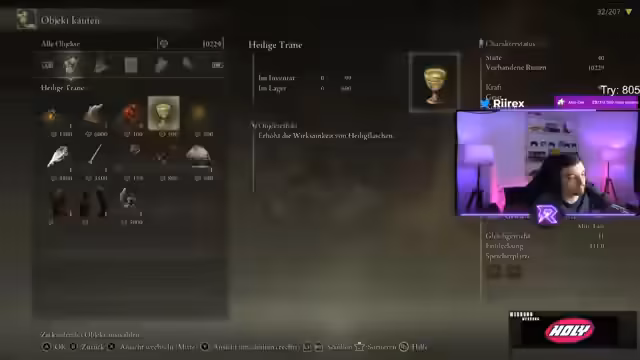04:13:21Der Streamer interagiert mit dem Chat und feuert die Zuschauer an, ihn als "Taschentuch" zu benutzen. Er fühlt sich von den Herausforderungen im Spiel "in den Arsch gefickt". Es wird überlegt, warum bestimmte Gegner schwer zu besiegen sind und welche Waffenstrategien am effektivsten sind. Der Streamer bedankt sich bei Zuschauern für Subscriptions und Spenden. Er äußert seinen Unmut darüber, dass er von Freunden zu Spendenaktionen angestiftet wurde. Er scherzt darüber, dass Twitch am Ende von den Spenden profitiert. Der Streamer möchte mit der Keule im Spiel spielen und findet sie gut. Ein Zuschauer fragt nach dem Karzenklo des Streamers. Es wird diskutiert, welcher Boss im Spiel am schwersten ohne Treffer zu besiegen ist, wobei Rinala genannt wird. Der Streamer erklärt, warum Rinala so schwer ist, nämlich wegen der Bücher und dem Feuer, die schwer zu timen und zu kontrollieren sind.
