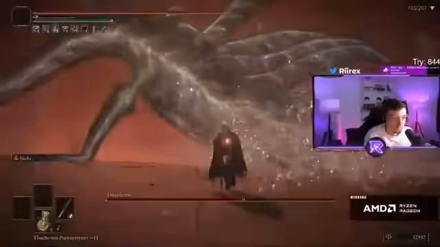 01:44:10Das Gameplay dreht sich um den Kampf gegen Bosse mit Hilfe der Teammitglieder. Der Streamer lobt den hohen Schaden, den das Team mit der plus 2 Waffe macht, und beschreibt die Dynamik des Kampfes, einschließlich der Nutzung von Heiltränken und Teamfähigkeiten wie das Entehaken, um sich an Gegner heranzuziehen. Er erlebt sowohl Momente starker Überlegenheit als auch Phasen, in denen er vom Gegner schnell besiegt wird. Es wird das Problem angesprochen, dass die Waffen nach einem Tod verloren gehen und nur die Relikte behalten werden.