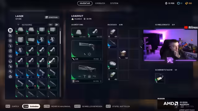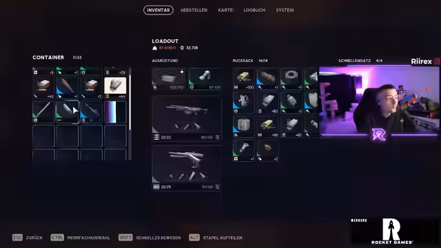 05:22:09Der Streamer stellt fest, dass sein Lager voll ist und er erweitern muss, wofür er 20.000 Münzen benötigt. Er beschließt, weniger wichtige Gegenstände wie Defibrillatoren, Vitasprays und Rauchgranaten zu verkaufen, um Platz zu schaffen. Er erwägt, Items zu craften, insbesondere mechanische Komponenten, die er für Quests benötigt, und plant, seine Ausrüstung zu optimieren, bevor er die nächste Map betritt.