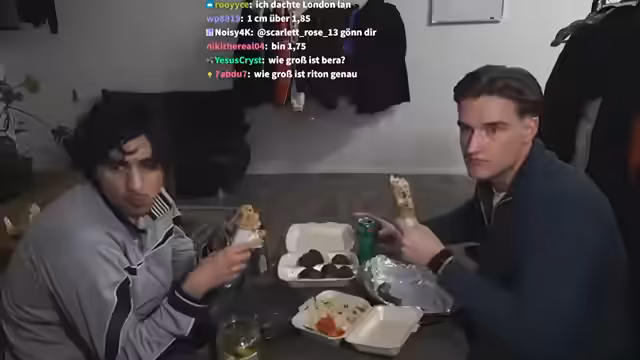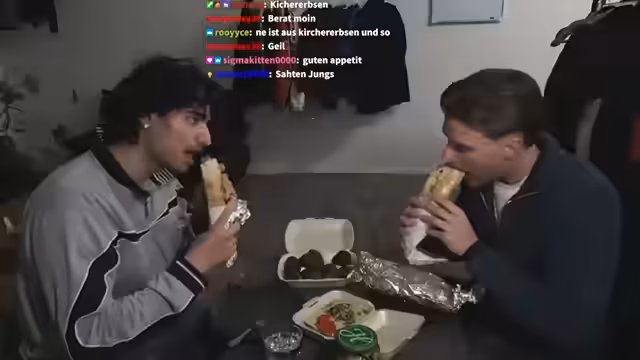 00:02:13Beide Streamer erwähnen, dass sie seit dem Morgen fasten und nun gemeinsam das Iftar einhalten. Sie beginnen mit dem Essen, wobei Berat Riton zunächst mit einem Scherz über einfache Gurkensandwiches täuscht, bevor er ein großes Essensbestellpaket enthüllt, das Hummus, Falafel, ein Shawarma-Sandwich und Cola Light enthält. Sie probieren das gemeinschaftlich, bewerten die Gerichte und interagieren mit dem Chat, der ebenfalls am Fasten teilnimmt.