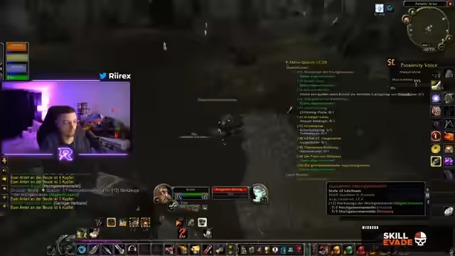 11:03:48Ein zentrales Thema ist die Frustration des Streamers über die Bogenschießfertigkeit. Er hat einen besseren Bogen gefunden, kann ihn aber nicht benutzen, da er die Fertigkeit nicht auf dieser Allianz-Seile lernen kann. Die Diskussion, ob man zu den Nachtelfen in deren Stadt reisen soll, um es zu lernen, eskaliert. Der Streamer lehnt riskante Skips ab und möchte einen normalen Weg, was zu großer Verärgerung und sogar zu Wehmut führt, da die Nutzung des Bogens als dringend erachtet wird.