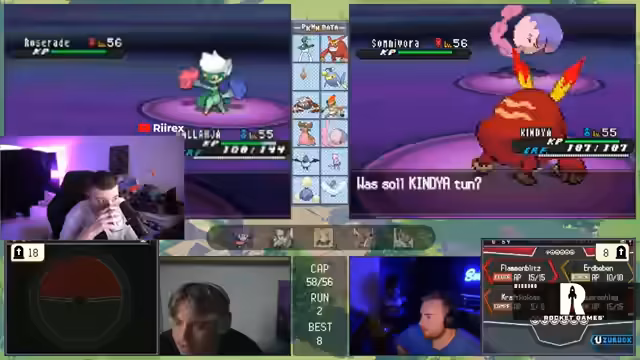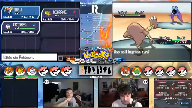 09:07:17Nach einem harten Kampf gehen zwei der wertvollsten Links des Streams, Bommel und Frosch, verloren. Dies führt zu einer emotionalen Reaktion des Streamers, der seine Confidence verloren zu haben glaubt und einen Neustart des Runs in Betracht zieht. Trotzdem beschließt er, weiterzuspielen, da noch starke Pokémon wie Knackrack und Lugia im Team sind und der Run somit noch eine Chance hat, erfolgreich zu sein.