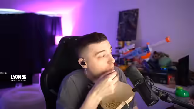 05:44:56Zwischen den Spielrunden wird eine kurze Pause eingelegt. Der Streamer erzählt von seinen Mahlzeiten, darunter Toast mit Ei und Frischkäse, Popcorn vom Vortag und den Plan, später Zucchini-Rinder-Pasta zu kochen. Er erwähnt seinen täglichen Gang ins Gym und seinen Fokus auf die Proteinzufuhr. Er diskutiert die Herausforderung, auf sein tägliches Proteinziel von 150 Gramm zu kommen, und verweist auf seine bevorstehende Keto-Diät, von der er seit drei Jahren spricht. Es wird humorvoll angemerkt, dass sein Rivale im Spiel Hans E heißt, was an ein bestimmtes Entertainment-Produkt erinnert.