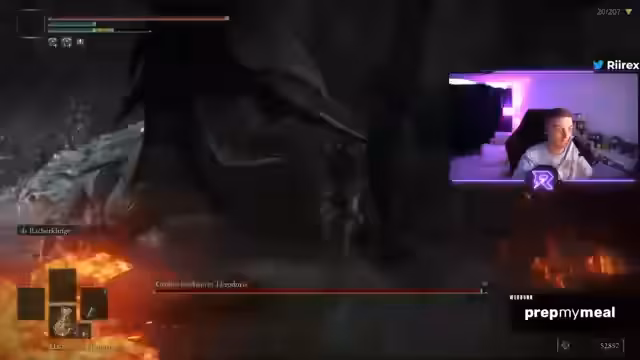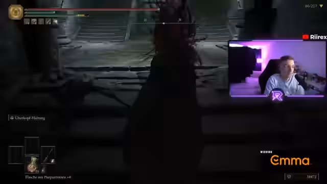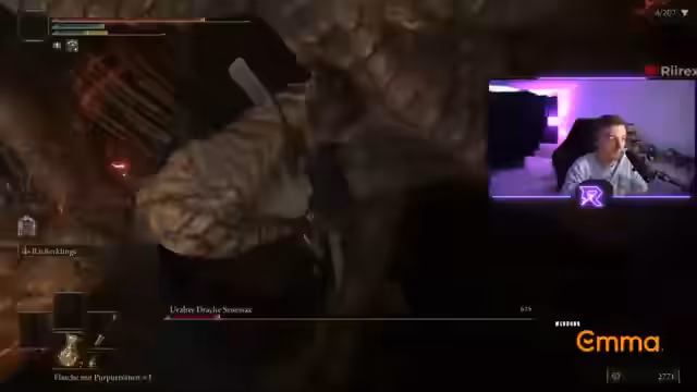 04:55:03Nach einem Tod bei einem DLC-Gegner, der mehr Schaden verursacht als der Streamer überleben kann, zeigt er sich sichtlich frustriert. Er erklärt, dass dieser Gegner mit DLC-Skalierung erscheint, er selbst aber nur mit Basis-Spiel-Inhalt spielt und den Schaden nicht ausgleichen kann. Dieser Fehlschlag lässt ihn an dem Lust an einem neuen Run zweifeln, da er das Gefühl hat, der Stream-Wunsch der Zuschauer, Elden Ring zu sehen, widerspreche dem Wunsch, dass der Run gelingt.