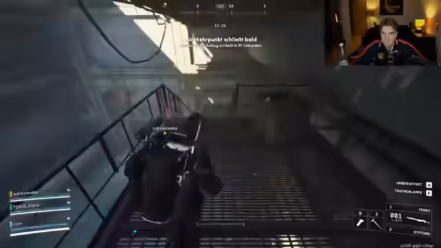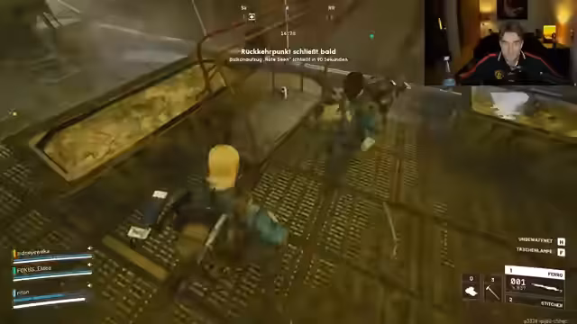 01:01:23Sidney und Riot treffen auf Spieler aus Frankreich, den Niederlanden und Deutschland. Sie versuchen, die Fremden durch das Spielen eines 'Free Loadout' zu beruhigen und signalisieren friedliche Absichten. Trotzdem sind die Spieler angespannt und misstrauisch. Die Szene zeigt die Herausforderungen der Kommunikation im Spiel und die Spannung zwischen unterschiedlichen Gruppen.