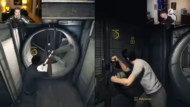 01:38:11Zu Beginn des Abschnitts koordinieren sich die beiden Spieler, um aus ihren Zellen zu fliehen. Der Fokus liegt auf der Durchführung einer Aktion zur Aufhebung einer Sperre. Dies erfordert präzise Abstimmung, da nur einer der beiden eine Taste zum richtigen Zeitpunkt drücken darf. Die Kommunikation erfolgt unter Zeitdruck und bei der ständigen Gefahr, von Wachen entdeckt zu werden. Der Erfolg hängt von der Synchronisation der Aktionen ab.