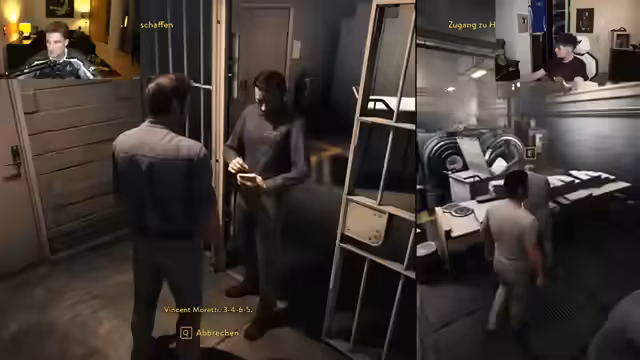 00:31:16Nachdem die technischen Probleme teilweise gelöst sind, beginnt das eigentliche Gameplay von 'A Way Out'. Die Charaktere, Vincent Moretti (gespielt von Eldos) und Leo Caruso (gespielt vom Streamer), werden im Gefängnis vorgestellt. Das Gameplay erfordert sofortiges Handeln; Leo muss sich duschen und sich dabei bedeckt halten, während Vincent in seiner Zelle bleibt. Beide Charaktere erhalten die Aufgabe, sich anfreunden zu müssen, um gemeinsam ausbrechen zu können. Während des Spielens müssen sie Wachen ablenken und sich unbemerkt bewegen, was durch einen gefährlichen Vorfall mit einem anderen Gefangenen erschwert wird.