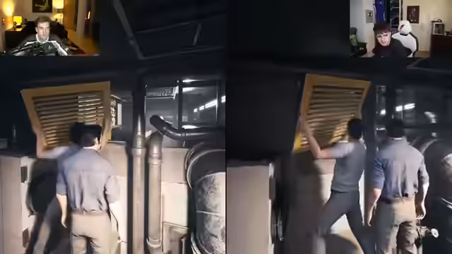 01:16:23Nachdem die Wache die beiden Charaktere getrennt hat, beginnt die eigentliche Zusammenarbeit. Leo muss dem anderen Gefangenen, Harvey, helfen, um dessen Vertrauen zu gewinnen, während Vincent zurück in seine Zelle muss. Die Mission erfordert, dass Vincent die Zellentür manipuliert. Die Kommunikation zwischen den Spielern ist jedoch durch Synchronisationsprobleme der Ingame-Sounds beeinträchtigt. Trotzdem gelingt es Vincent, mit einer List die Wache zu täuschen und die Tür zu öffnen. Der Abschnitt endet damit, dass er Leo Hilfe signalisieren will, während dieser gerade den abgelenkten Warden belauscht.
