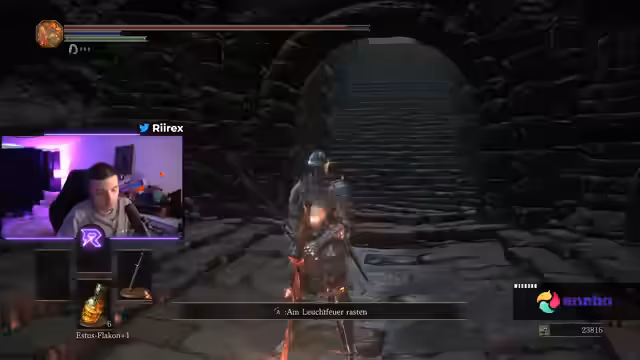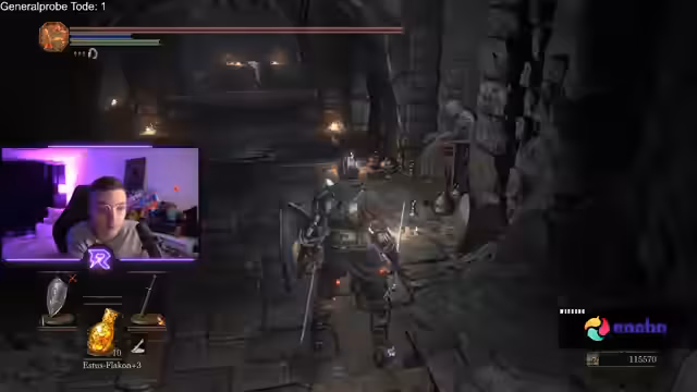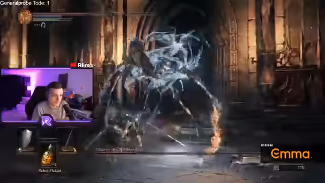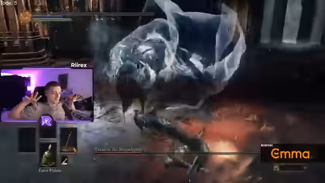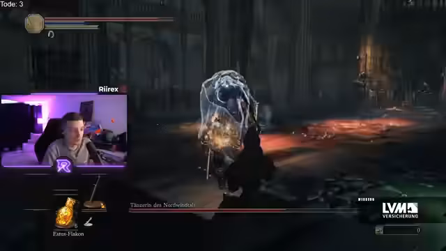 00:39:16Der Streamer startet den praktischen Versuch des "No Death Runs" in Dark Souls 3. Er folgt gelernten Routen, sammelt früh wichtige Gegenstände wie Titanit-Scherben und Astros-Flaschen und nutzt Schwarze Brandbomben, um problematische Gegner aus der Distanz zu besiegen. Nach dem erfolgreichen Sieg über den ersten Boss, die Wolkenfrauin Yorshka, steht der entscheidende Kampf gegen die Tänzerin an, die als größte Herausforderung im frühen Spielverlauf gilt.