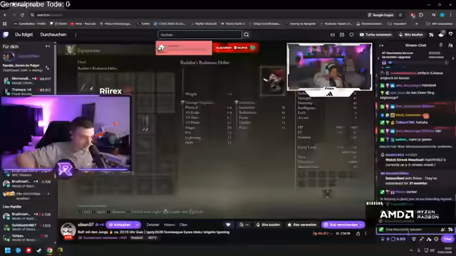 09:20:40Ein großer Teil des Streams ist einem First-Kill-Versuch von Malenia gewidmet. Der Streamer kommentiert den Versuch eines anderen Spielers, der ohne Mana-Tränke kämpft. Es wird ein Wettbewerb im Chat inszeniert, bei dem 100 Subs für einen First-Kill von Malenia geboten werden. Währenddessen wird die eigene Route, nach dem Tod an einem simplen Gimmick-Boss, neu justifiziert, um mehr Untote Splitter für Waffen-Upgrades zu sammeln.