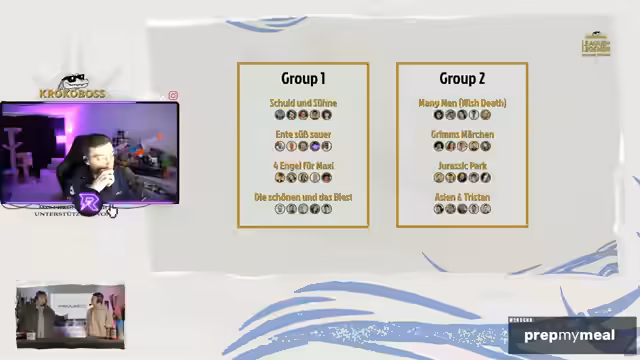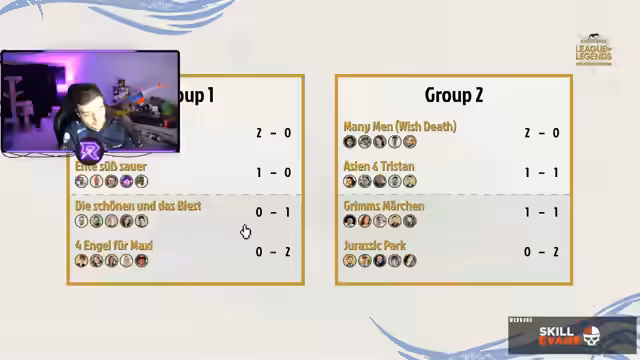 05:16:26Koko erhält eine wichtige Anweisung: Bis zum Ende des Turniers soll er, wenn er mit der Regie spricht, immer die Hand ans Ohr halten, um professionell zu wirken. Der Streamer fragt nach Teams, die 3:0 stehen, und es wird bestätigt, dass dies möglich ist. Kurz darauf werden die aktuellen Standings präsentiert: Schuld und Sühne führt mit 3:0, Ente süß-sauer steht 2:1, Die Schöne und das Biest 1:2, und 4 Engel für Maxi hat Startschwierigkeiten mit 0:3. In Gruppe 2 gibt es ähnliche Standings, wobei ein Team ebenfalls 3:0 führt. Es wird erwähnt, dass einige Spieler wie Nicoletta oder Hass als hart für ein Team gelten, aber anscheinend funktioniert es gut. Asien und Tristan stehen 2:1 und bewegen sich Richtung Upper Bracket. Grimms Märchen und Team Jurassic Park haben ebenfalls Startschwierigkeiten mit 1:2 bzw. 0:3.