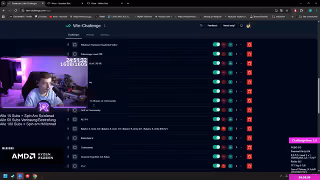 09:25:07Der Streamer blickt auf die bisherigen neun Tage der Challenge zurück und zeigt sich beeindruckt vom Verlauf. Er hatte ursprünglich nur mit ein bis zwei Tagen gerechnet, ist jetzt aber auf dem besten Weg, seinen eigenen Rekord von 2700 Subs in 31 Tagen zu brechen. Derzeit liegt er bei fast 1600 Subs in neun Tagen, was einer Rate von fast 200 Subs pro Tag entspricht. Er betont, dass die Challenge einzigartig ist, da es kein einfaches 'Abhaken' von Zeit ist, sondern eine ständige Abfolge von Spielsessions, was er als sehr anspruchsvoll aber auch fesselnd beschreibt.