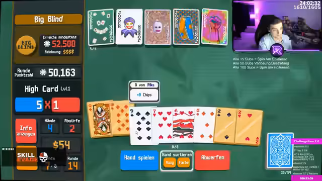 07:31:49Ein Wendepunkt im Stream ist die Entdeckung der 'Glückskarten', die dem Streamer enorme Multiplikatoren bringen. Er zeigt sich begeistert von der Strategie, Karten zu verkaufen, um den aktuellen Bossplan zu deaktivieren und so bessere Chancen zu schaffen. Insbesondere der Drilling wird zur prioritären Strategie, da er im Vergleich zum Full House eine höhere Punktausbeute verspricht. Der Streamer analysiert seine Karten intensiv, um die gewinnbringendste Kombination zu finden, und findet in den verbesserten Multiplikatoren den Schlüssel zum Erfolg, was seine Stimmung merklich hebt.