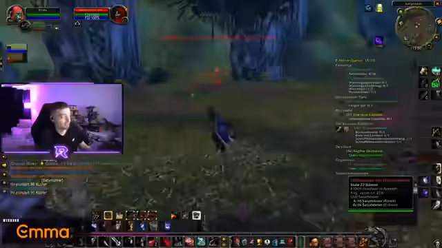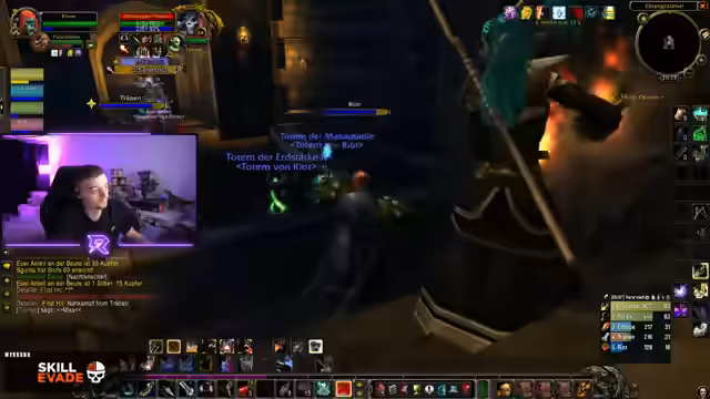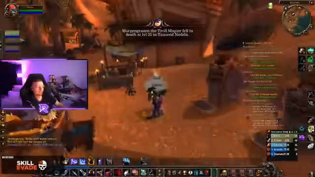 05:50:44Hochrisiko-Situation bei Yeti-Quests: Vier Mobs über seinem Level überlebt er nur durch Totschillen-Skill und Glück. Dropt eine Halskette mit +6 Ausdauer (60 LP) als Belohnung. Danach Suche nach Blutstein-Marmor in Schlingendorntal, wo Quest-Mobs fehlen. Diskussion über Taktiken – Pet-Führung, Aspekt-Management – und Frust über verbuggte Elevatoren. Level 33 wird gefeiert, weiteres Grinding für EP geplant.