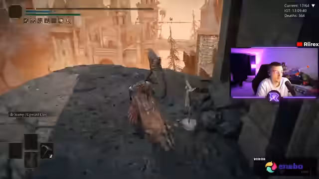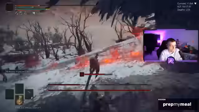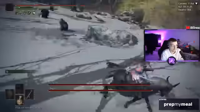 01:04:06Der Streamer stellt fest, dass er gegen den Boss, einen unsichtbaren Assassinen, überlevelt ist, dieser aber DLC-Schaden verursacht, während er selbst kaum Schaden anrichtet. Er erkennt, dass er eine bessere Waffe benötigt, um die kommenden Herausforderungen zu meistern, darunter Bosse wie Morgoth, Godfrey, den Feuerriesen, das Godskin Duo, Malekir und Malenia. Er kämpft gegen einen NPC-Gegner, der überraschend viele Heiltränke besitzt und dessen Bubble-Effekt so geändert wurde, dass er sofort tödlich ist. Nach einem langen und frustrierenden Kampf gegen den NPC, der sich als extrem widerstandsfähig erweist, besiegt er diesen schließlich. Die nächste Herausforderung ist ein Hummer und eine Krabbe, gefolgt von einer Leiter, was ihn verwirrt, aber letztendlich zum Rhode Medallion führt. Er entscheidet sich, das Schneegebiet zu erkunden, um dort "Sommer 6" zu finden, ein Material, das er benötigt, um seine Waffe auf Plus 8 zu verbessern.