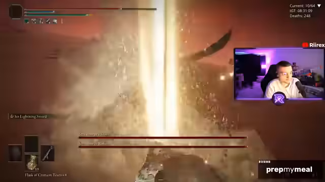 01:57:06Der Streamer steht vor der Herausforderung, drei Prime Radahn gleichzeitig zu besiegen. Er entscheidet sich, seine Waffe auf Plus 8 zu verbessern, um den Schaden zu erhöhen, obwohl er unsicher ist, ob sich dies lohnt. Er versucht, die Radahns voneinander zu trennen, indem er einen in die Luft fliegen und einen Nuklearschlag ausführen lässt, wodurch dieser verschwindet. Nach mehreren Versuchen gelingt es ihm, einen der Radahns zu eliminieren. Er muss nun gegen die verbleibenden zwei kämpfen, die jeweils eine normale und eine Prime-Phase haben. Nach einem intensiven Kampf besiegt er die Radahns und erhält eine zusätzliche Heilung. Er macht sich auf den Weg zu einem Grab, um das Buckler-Schild zu finden, das ihm gegen die "Madness-Typen" helfen soll, obwohl er nicht geübt im Parieren ist. Er bestellt sich ein neues iPhone 17 Pro, da sein altes iPhone 13 Pro eine schlechte Kameraqualität hat.
