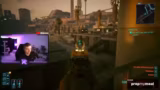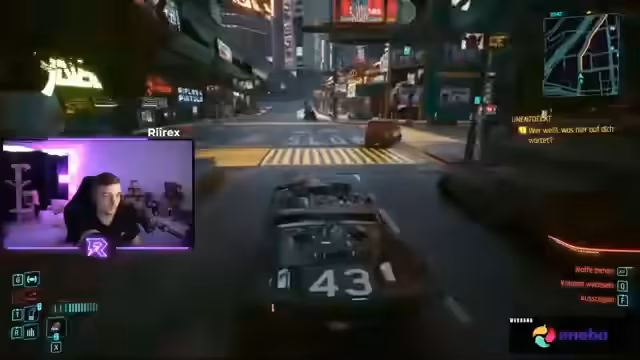 02:57:10Im weiteren Verlauf der Mission muss der Streamer ein bestimmtes Delamain-Fahrzeug für die Taxi-Firma finden. Er gerät dabei in erhebliche Frustration, da er das Fahrzeug trotz intensiver Suche nicht im angegebenen Sektor finden kann. Es kommt zu einer Verfolgungsjagd mit der Polizei, die er schließlich für sich entscheiden kann. Nachdem er das Fahrzeug findet, zeigt er sich von seinen Leistungsdaten und seiner Bewaffnung beeindruckt.