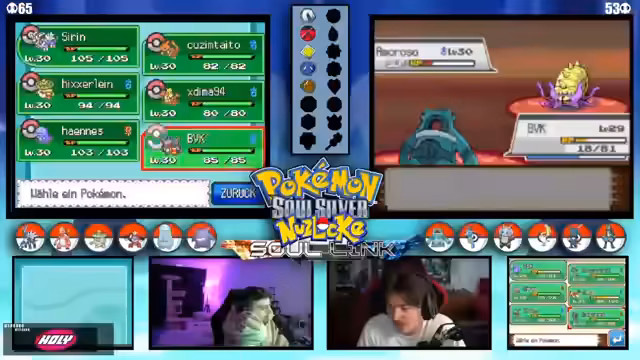 06:18:35Der Nuzlocke-Run steht im Mittelpunkt. Der Streamer kämpft mit seinem Team, das bereits sichtbare Schwächen aufweist, gegen einen Gegner mit starken Attacken. Es werden taktische Überlegungen angestellt, wie man die gegnerischen Attacke Sturzflug am besten ausmanövrieren kann. Der Streamer analysiert die Statistiken und attacken seiner Pokémon, wie Bronzong und Taubos, um die bestmögliche Entscheidung für den Kampf zu treffen. Das Leveln der Pokémon auf 28 und der Wunsch nach einem günstigen Catch wie dem Sondersensor werden als strategische Ziele genannt.