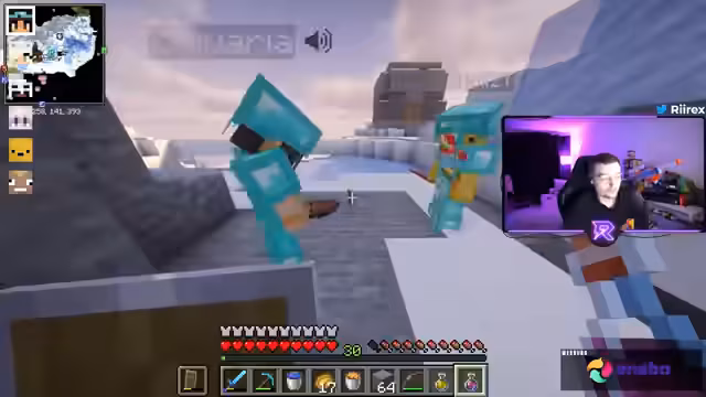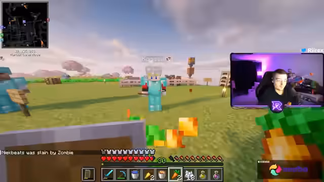 04:10:40Der Streamer erhält Diamant-Rüstung und Werkzeuge. Trimax wird mit voller Diamant-Ausrüstung und einem 'Dichte Buch 4' als besonders gefährlich eingestuft. Noreax tötet Trimax temporär, aber die Bedrohung bleibt bestehen. Es folgen Diskussionen über die notwendige Anzahl an Diamanten für komplette Rüstungen. Gleichzeitig wird Trimax' Fortnite-Erfolg (1.500 Euro Earnings) thematisiert.