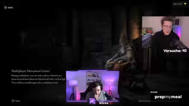02:09:19Im weiteren Verlauf des Streams werden mehrere Bosse bekämpft. Ein zentrales Thema ist der strategische Vorgehen gegen die Sonnenblume. Bevor der Kampf beginnt, wird die Karawane gestoppt, um zu verhindern, dass der Boss im Kampf unterbrochen wird und verärgert wird. Der Streamer äußert seine Abneigung gegen einige Gegner, insbesondere gegen Fäulende Ritter, die durch ihre verzögerten Angriffe und Schildblock-Fähigkeiten sehr nervig sind. Die Kommentarsparte liefert kontinuierlich Tipps und Anregungen zum Spielstil und zur Waffenausrüstung.
