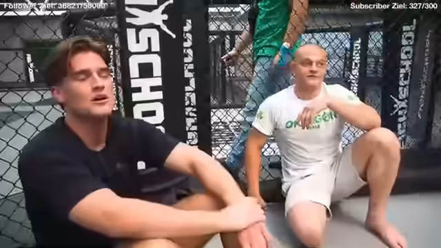 00:17:45Die beiden Kämpfer einigen sich auf eine Challenge: Wenn der Streamer es schafft, zwei Minuten gegen Max Holzer im Grappling durchzuhalten, ohne zu tappen, darf er beim Einlauf von Max Holzers nächstem Event in Hannover im September sein. Das Sparring findet im Cage statt, wobei beide Kämpfer Schutzausrüstung tragen, darunter Kopfschutz und Handschuhe.