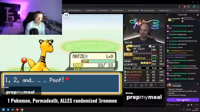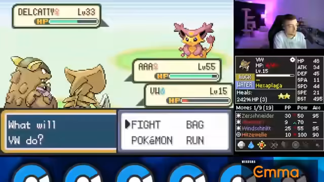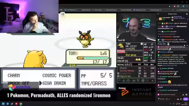 00:10:09Der Streamer bemerkt, dass er vergessen hat zu randomisieren, was zu Problemen führt. Er äußert seine Unbegeisterung für Fußballspiele wie FIFA und Rocket League, in denen er keinen Ego-Stress hat. Mats diskutiert verschiedene Pokémon-Entwicklungen und Attacken, wobei er besonders über die Stats der Pokémon und deren Entwicklungsebene nachdenkt. Er stellt fest, dass er bisher noch nie eine Evil-Entwicklung gehabt hat und debattiert, welches Pokémon er mitnehmen sollte.