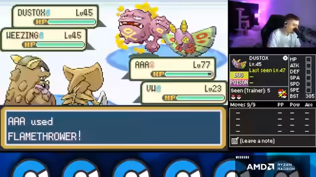 04:24:31Der Streamer spricht über schwere Kämpfe und Destiny-Bond, das gefährlich ist und nicht geschützt werden kann. Er ist verärgert über 200 Speed, die er als maximum scheiße bezeichnet, aber jedes Pokémon hat Feuerfänger im aktuellen Run. Er erwähnt einen gefährlichen Moment, wo er fast den Run verloren hätte, und überlebt nur mit 10 KP durch Sandstorm und Verwirrung.