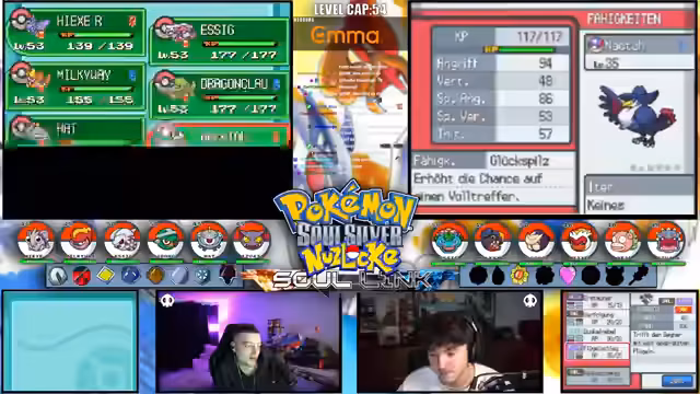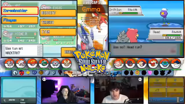 04:03:41In diesem Abschnitt diskutieren die Streamer ihre Pokémon-Auswahl und Herausforderungen in der Soullink Challenge. Sie nennen ihre Pokémon wie 'Ivy' für Pflanzen-Denkmäler und erwähnen Schwierigkeiten in Azura City, das als 'tot' beschrieben wird. Es gibt Vergleiche mit früheren Runs, etwa als 'Schradin' Eldring erfolgreich bewältigte, und Überlegungen zu Bosskämpfen, wobei sie einschätzen, wie lange ein Kampf gegen Marlene dauern könnte. Zusätzlich werden Optionen zum Fangen neuer Pokémon wie Arcani oder Kitsch besprochen, wobei sie sich überlegen, ob sie risikoreiche Encounters eingehen sollten, um ihr Team zu verbessern.