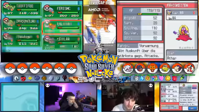02:26:26Da die Pokémon-Liste weiterhin fehlt, wird die Soullink Challenge faktisch unterbrochen. Die Spieler diskutieren替代ative, etwa das Fangen von Pokémon auf Route 6, gestehen aber ein, dass dies ohne Liste chaotisch wäre. Sie betonen, dass die Challenge bereits gewonnen wurde, da Zeitlimit (bis 0 Uhr des Vortags) abgelaufen ist. Es folgen Planungen für zukünftige Sessions und das Einwerben von Helfern für die Listenverwaltung. Abschließend wird über Pokémon wie Makago und Ampharos spekuliert, während auf eine detaillierte Liste von Erich gewartet wird.