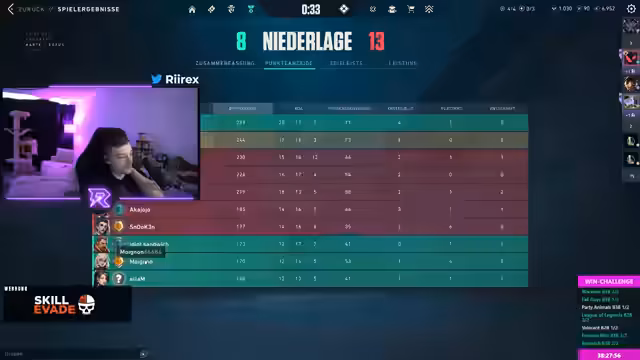05:00:29Hohe emotionale Beteiligung bei einem Valorant-Spiel, bei dem der Streamer sichtlich wütend ist. Er fühlt sich betrogen, da er trotz Sieges keinen 'GG' erhielt und die Stats seines Gegners genau analysieren will. Die Frust ist so groß, dass er seine Wut lieber im Teamkanal an anderen Mitspielern auslassen würde, als mit diesem Spieler weiterzuspielen.