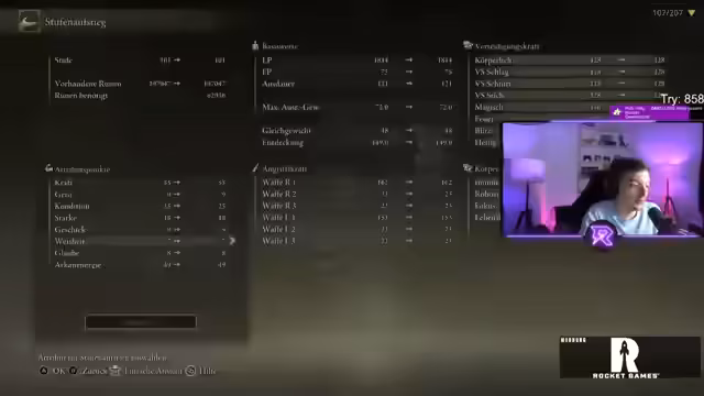 08:10:08Der Streamer testet einen neuen Build, der auf extrem hohen Blutungsschaden ausgelegt ist. Er nutzt zwei Waffen mit über 100 Blutung und den Talisman 'Jubel des Blutes', der den Schaden bei Bluteffekten um 30% erhöht. Er experimentiert damit, die Waffen auf 'Okkult' umzuschalten, um von deren guten Skalierungen zu profitieren. Mit bereits über 500 Schaden pro Schlag und der Aussicht auf weiteren Schaden durch Talismane, sieht er hier das Potenzial für einen 'insanen' Build.