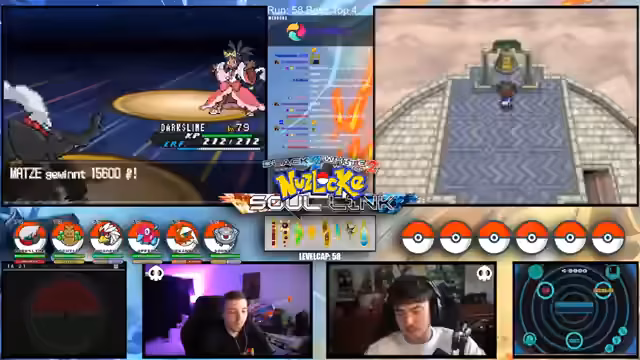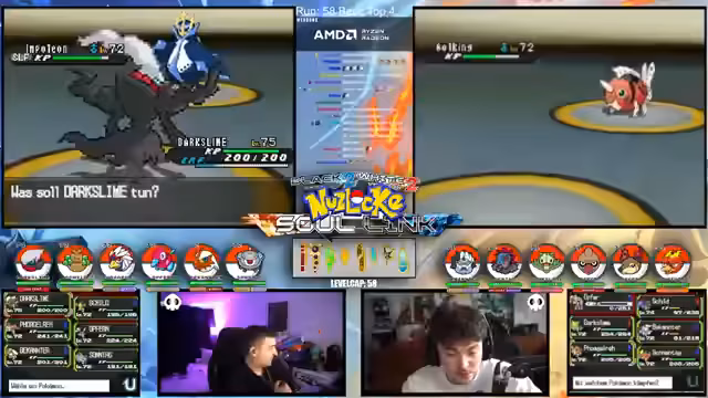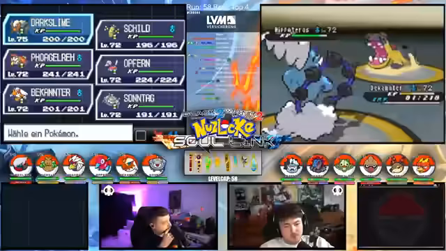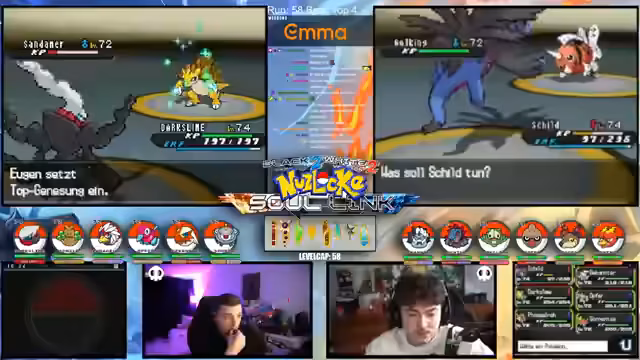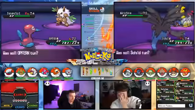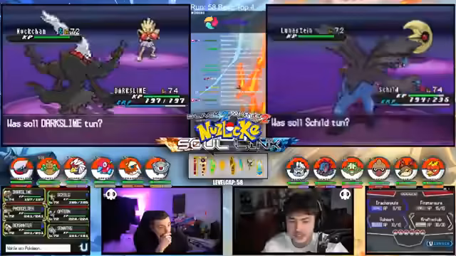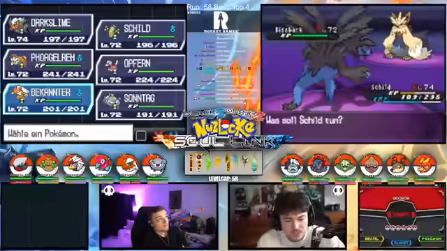 01:14:21Es geht um die kritischen Entscheidungen im Kampf. Nachdem mehrere Pokémon wie Mitashi und Revolver durch hohe Schaden erlitten haben, wird über die nächsten Schritte gesprochen. Das Team mit Quirtel, Logok und Milotic ist geschwächt. Die Strategie wechselt und es geht darum, das Team mit Schild, Opfer und Vogelreh neu zu formieren. Dabei wird diskutiert, ob Dark Slime oder anderes Pokémon eingesetzt werden sollen, um die Kampf-Schwächen des Teams auszugleichen.