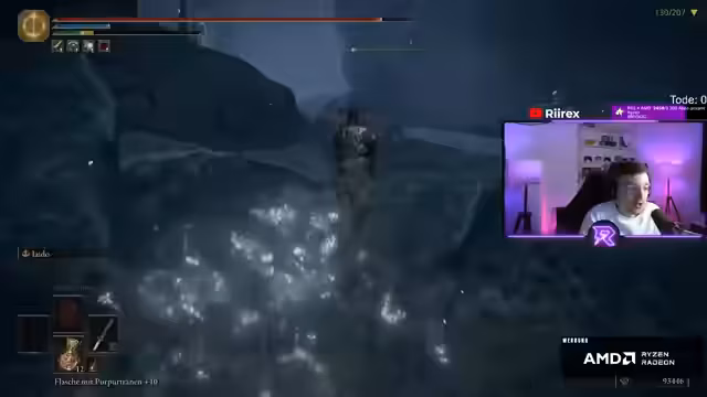 07:49:56Der Streamer nahm die Herausforderung des Bosskandidaten an, der sich als 'Zörtel, der Mächtige' vorstellte und ihn bedrohte. Der Streamer, der sich als 'Lord Ryrux, Elden Lord' bezeichnete, attackierte den Gegner direkt. Der Kampf war kurz und der Streamer wurde besiegt, was sein erstes offizielles und unumstrittenes Sterben im Stream markierte. Schockiert von dieser Niederlage fragte er mehrfach 'Das ist mein erster Tod?', was seine anfängliche Arrogung und die verlorene Unbesiegbarkeit unterstrich und einen Wendepunkt im Stream darstellte.