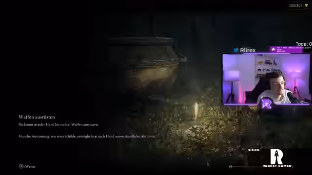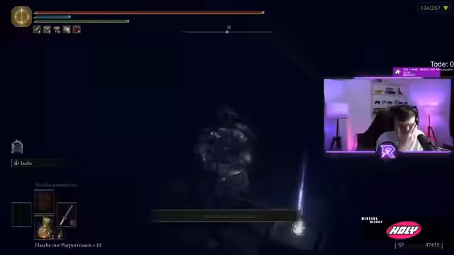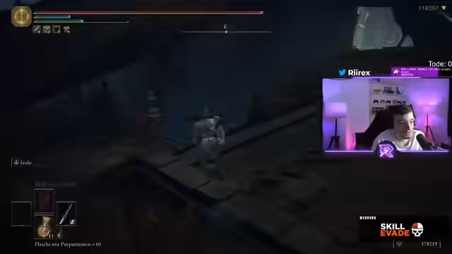 03:13:52Der Streamer navigiert durch gefährliche Dungeon-Bereiche in Elden Ring, wobei er trotz des hohen Risikos von Fall-Schaden stürzt und stirbt. Er diskutiert die Mechanik der Blutungs-Waffe und die Unterschiede zwischen den Verzauberungsarten Blutig und Okkult. Der zwingende Weg durch den umgedrehten Turm für die Rani-Quest quält ihn zutiefst. In einem untypischen Moment erkennt er eine Anspielung im Stream-Titel '!programmAlle 207 Bosse töten ohne zu sterben', die er vorher nicht bemerkt hatte.