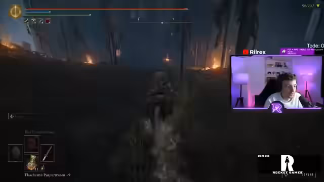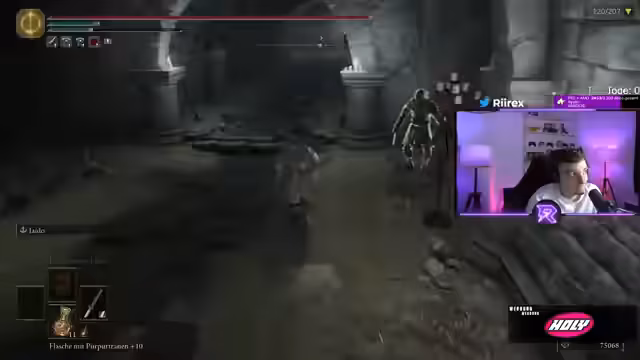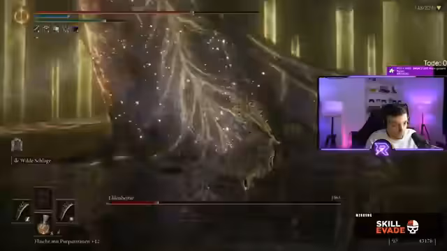 03:25:56Der Stream startet mit der Herausforderung, alle 207 Bosse in Elden Ring ohne zu sterben zu besiegen. Der Streamer navigiert durch verschiedene Bereiche und stößt auf den NPC Blade, der als sehr stark beschrieben wird. Es wird die Rani-Questline erwähnt, und es werden wichtige Items wie der Dunkelmondring und der Drachenschuppen, der für das Katana benötigt wird, diskutiert. Der Streamer befindet sich im Scharlachbecken und kämpft gegen den Drachenblutsoldaten.