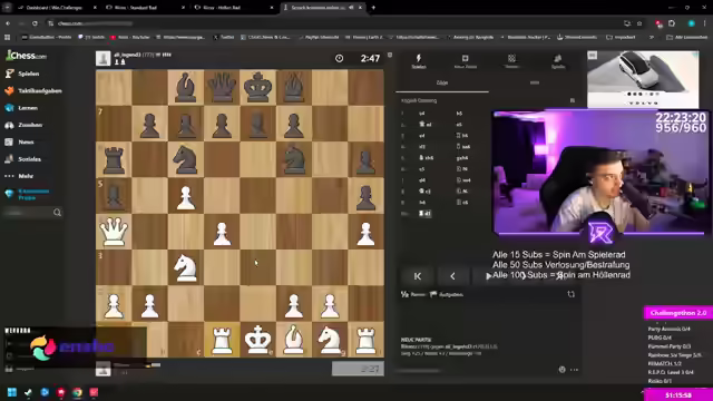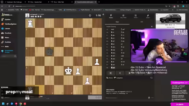 04:10:03Es wird ein Schachspiel gewonnen. Anschließend wird überlegt, Scribble durch ein ähnliches Spiel auf Steam zu ersetzen, bei dem der Chat mitraten kann. Die Idee wird jedoch verworfen, da Scribble für die Community besser geeignet erscheint. Alternativ werden Community-Spiele wie Codenames diskutiert, bei denen zwei Leute aus dem Chat gegeneinander antreten. Es wird die Frage aufgeworfen, ob Zuschauer Kisten in CS2 geöffnet sehen möchten, jedoch wird auf die 7-Tage-Handelssperre hingewiesen. Der Wunsch nach asiatischem Essen wird geäußert und die Vorbereitung einer Prepar Meal Bestellung angekündigt.