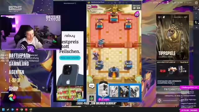 00:01:21Der Streamer startet mit Clash Royale und kommentiert das Spielgeschehen, einschließlich verschiedener Deckstrategien wie Lockbait und Mega Knight. Er diskutiert über Tower Damage, Elixierkosten und den Einsatz verschiedener Karten wie Hexe, Nachthexe und Infernoturm. Es folgen mehrere Spiele, in denen er Siege erringt, aber auch Niederlagen einsteckt, wobei er seine Strategien anpasst und über die Stärken und Schwächen bestimmter Kartenkombinationen nachdenkt. Er äußert sich kritisch über den Clan-Namen eines Gegners und kommentiert humorvoll seine eigenen spielerischen Fehler. Im Chat kommt es zu Diskussionen, bei denen der Streamer auf Kommentare eingeht und erklärt, dass er negative Äußerungen ignorieren wird, um den Spaß am Stream nicht zu trüben. Er betont, dass ihm der Spaß am Spiel und die Interaktion mit einem positiven Chat wichtig sind. Er spricht über Balance-Probleme im Spiel und äußert seinen Unmut über bestimmte Karten wie die Bossbanditin, die er als zu stark empfindet. Abschließend versucht er, ein Event im Spiel abzuschließen, wobei er feststellt, dass er nicht genügend Marken hat, um den Banner zu erhalten. Er stellt Timer für Windchallenges ein und reiht sich in die Warteschlange ein, um weitere Spiele zu bestreiten.
