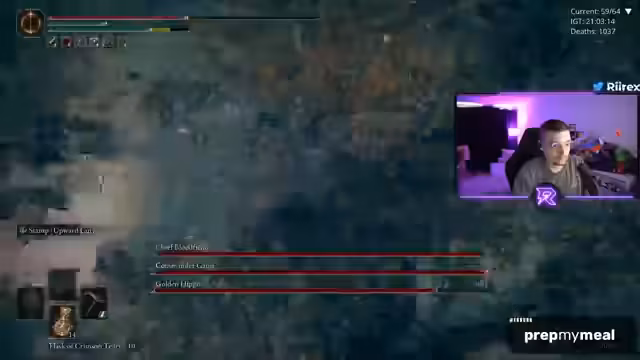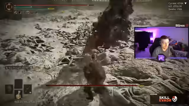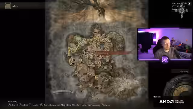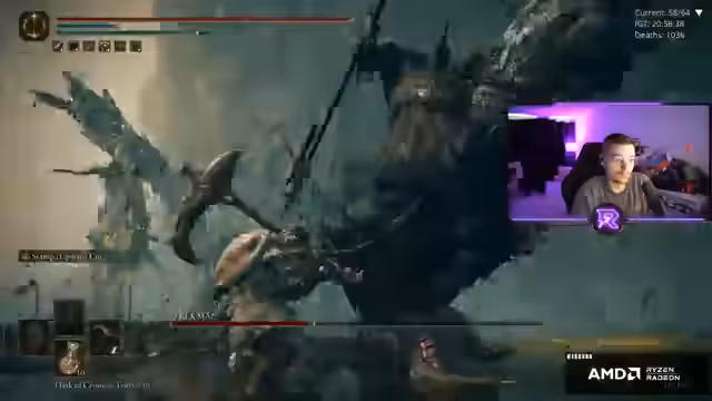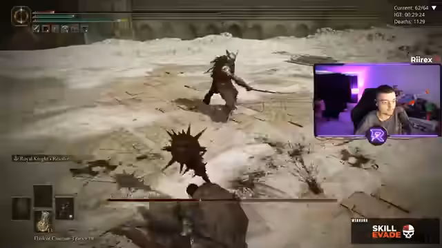 00:25:01Der Streamer ist sich unsicher, ob er auf dem richtigen Weg ist und stellt fest, dass er im Kreis gelaufen ist. Er fragt sich, ob er das Wasser überhaupt hätte ablassen müssen. Er ist frustriert, dass er sich keine Zeit zum Nachdenken nehmen kann, da er ständig von Monstern angegriffen wird. Er schätzt, dass er es bis 16 Uhr schaffen könnte, da noch einige 'ekelige Bosse' warten, darunter zwei Trio-Boss-Fights und Malek und Radagon. Er muss um 18:17 Uhr nach Frankfurt fahren und hat zweieinhalb Stunden Fahrt vor sich. Er überlegt, wie cool es wäre, wenn ein neues Elden Ring DLC angekündigt würde, um alles neu zu entdecken. Er kämpft gegen einen Dunkelkavalleristen in einem anderen Skin und ist frustriert über dessen Schaden und seine eigene Unfähigkeit, bestimmte Attacken auszuweichen. Er hat noch vier Bosse vor sich, darunter den Endboss und drei weitere, die er besiegen muss. Er plant, mit dem Trio-Boss-Fight zu beginnen und ist frustriert über das hohe Scaling der Bosse, die ihn mit ein oder zwei Treffern töten, obwohl er Skado Level 18 hat.