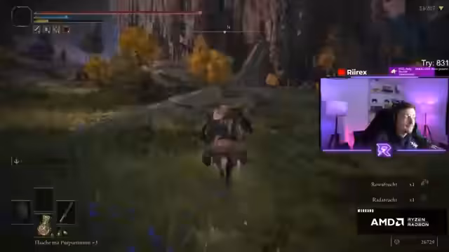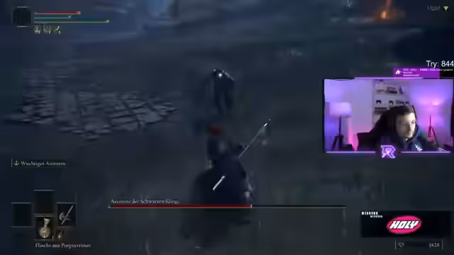 00:03:45Zu Streambeginn klärt der Streamer auf, warum sein Elden Ring-Video ein Stream und kein hochgeladenes Video ist. Der Hauptfokus des Streams liegt auf einem Elden Ring Randomizer Run, bei dem er alle 207 Bosse ohne zu sterben bezwingen möchte. Er preist sein aktuelles Equipment, darunter Relanas Kamee und Scherbe eines Kriegsgefäßes, und gibt einen Ausblick auf den späteren Among Us Stream gegen 20:30 Uhr.
