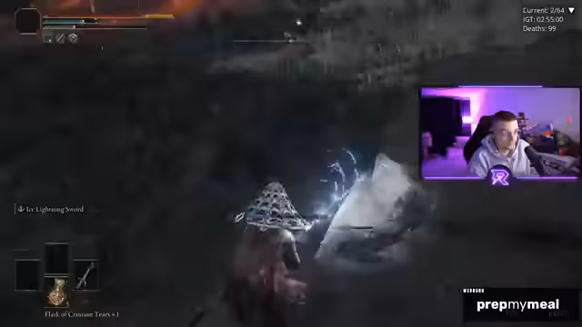 03:02:44Nachdem er den Weg durch Schloss Morn geschafft hat, stellt sich ihm die bislang größte Hürde erneut dar: der Boss, der durch Schnecken beschworen wird. Der Streamer erkennt, dass es einen Trick geben muss, um die richtige Schnecke zu identifizieren. Nach zahllosen Versuchen und Toden, bei denen er immer die falsche Schnecke traf, findet er eine mögliche Lösung: Frostschaden. Wenn er die Schnecke einmal einfriert, kann er deren Position genau verfolgen. Dies führt zu einem knapp gewonnenen Kampf, bei dem er den Boss besiegt. Trotz dieses Erfolgs ist der Kampf frustrierend und RNG-basiert.