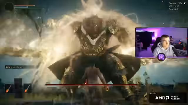 00:44:49Nach mehreren gescheiterten Versuchen gegen Prime Radan wechselt der Streamer die Waffe von den Magma-Klingen zur Flamberge, um auf Haltungsschaden zu setzen. Die Entscheidung scheint sich zu lohen, aber er kämpft weiterhin mit der Taktik und wird immer wieder durch Sprungattacken getroffen. Nach viel Mühe schafft er es schließlich, Prime Radan im dritten Versuch zu besiegen und die erste Hürde der Mod zu überwinden.