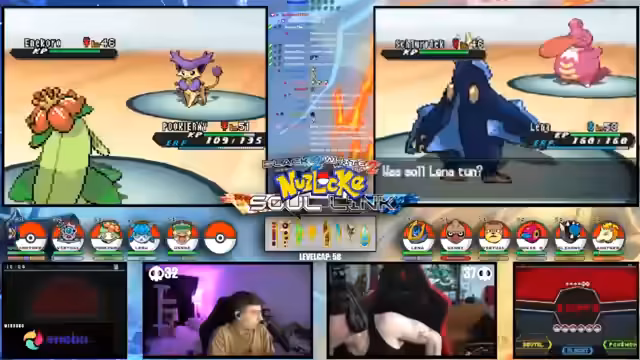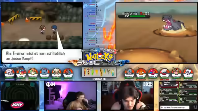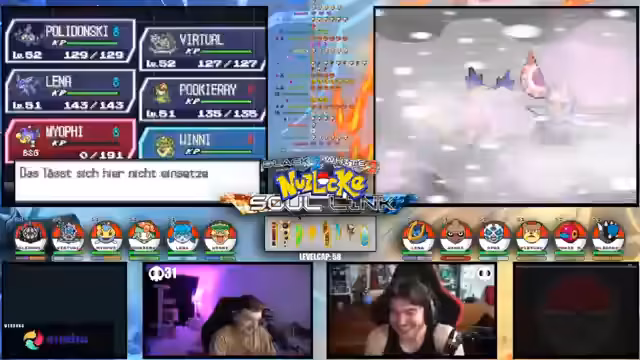 03:29:18Vor den Top-4-Kämpfen wird die eigene Mannschaft analysiert. Es wird eine große Kampfschwäche im Team ausgemacht, was eine strategische Änderung erfordert. Polidonski wird gegen Lasho King ausgetauscht, um ein starkes Psycho-Pokémon zu haben. Das Level-Cap liegt bei 51, was ideal für die bevorstehenden Kämpfe gegen das Plasma-Team ist. Dabei wird die Entwicklung von Lamos zu Dings in Betracht gezogen.
