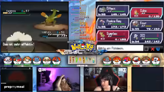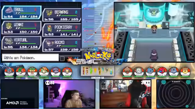 00:52:34Nach dem Verlust eines Schlüssel-Pokémons beginnt der Streamer, sein Team neu zu organisieren. Er überlegt, welches der verbleibenden Pokémon er ins Team aufnehmen soll, und entscheidet sich für ein neues, schnelles Pokémon. Er fängt ein weiteres Pokémon, einen Brecher, mit einem Traumball und stellt fest, dass sein Team jetzt Level 45 erreicht hat. Er spricht über die strategische Notwendigkeit, seine Pokémon anzupassen, um den steigenden Schwierigkeitsgrad zu bewältigen.