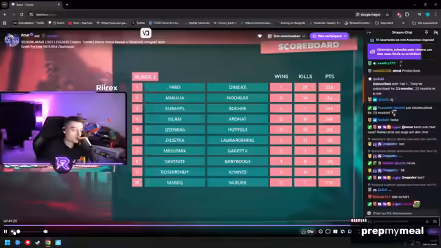 01:03:50Das Turnier schreitet voran. Das Team bleibt bei ihrer Strategie, sich Plätze zu sichern, und wird dabei Zeuge von sehr aggressivem Spielern wie Fabo, der in einer Runde 18 Kills erzielt. Dies führt zu Diskussionen im Chat über das Potenzial von Nerfs für bestimmte Waffen. Gleichzeitig wird eine Sperrliste ("Schere") für unerwünschte Teilnehmer wie FIX erwähnt, um das Erlebnis für die Community zu schützen und die Konzentration auf das Spiel zu bewahren.