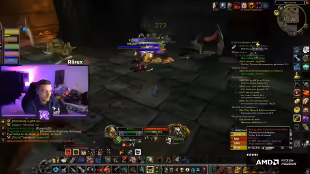 02:57:28Nach anfänglichen technischen Problemen mit dem Internet beginnt der Dungeon. Es werden erste Mobs bekämpft und es stellt sich heraus, dass einige besonders starke Angriffe wie 'Sweeping Strike' haben, die spezielle Aufmerksamkeit erfordern. Die Kommunikation ist wichtig, um Positionierung und Aggression zu koordinieren und den Schaden zu verteilen.