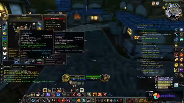 01:04:32Der Streamer berichtet über den Fortschritt der Gildemitglieder, darunter auch der Arbeitskollege seiner Freundin, der ihm beim Leveln von Tolkien half. Er beginnt mit der Vorbereitung für die Questreihen in den westlichen Pestländern, da dort ein sehr guter Ring für den Priester Sigi droppt. Dafür müssen jedoch mehrere Voraussetzungs-Quests erledigt werden, was für den Nachmittag geplant ist.